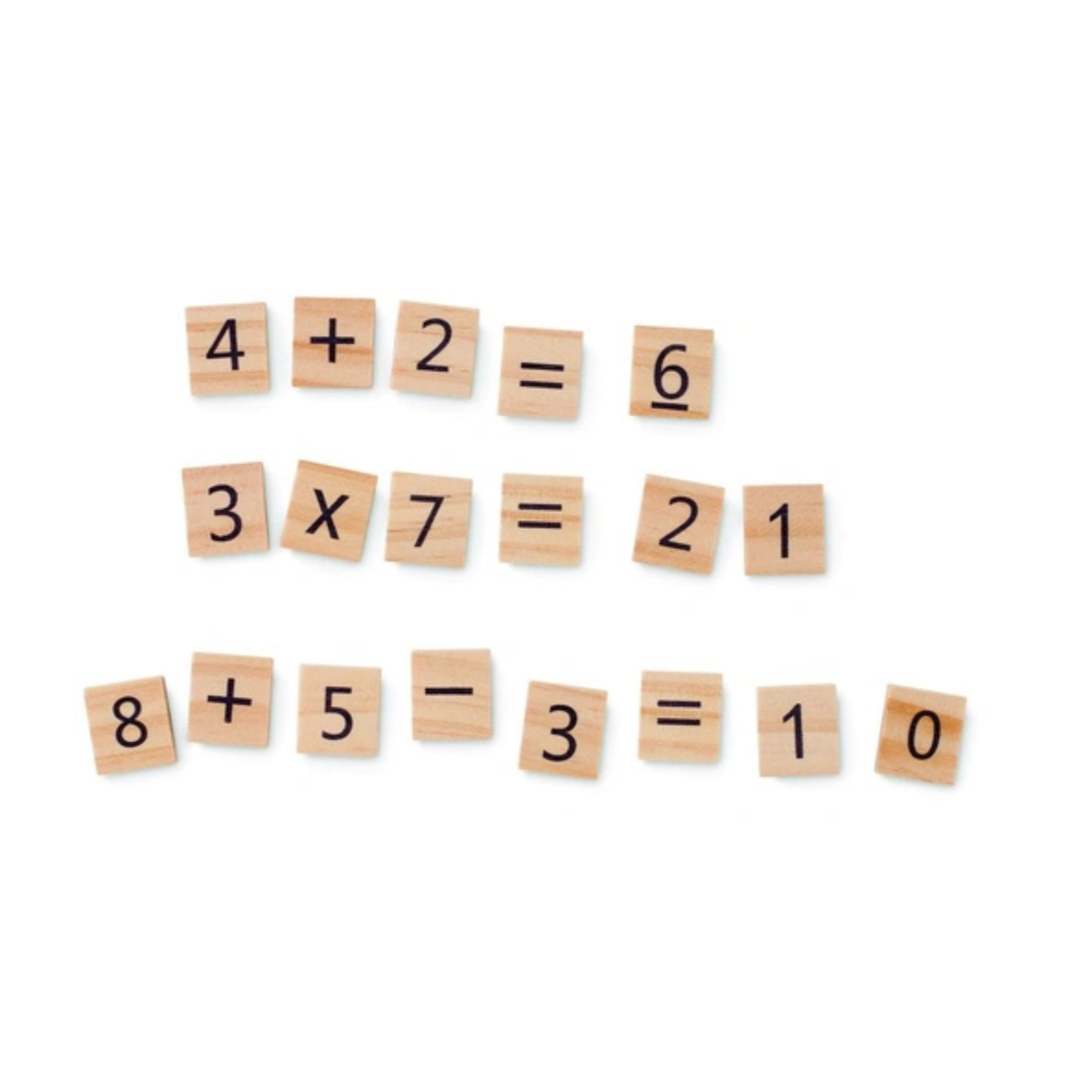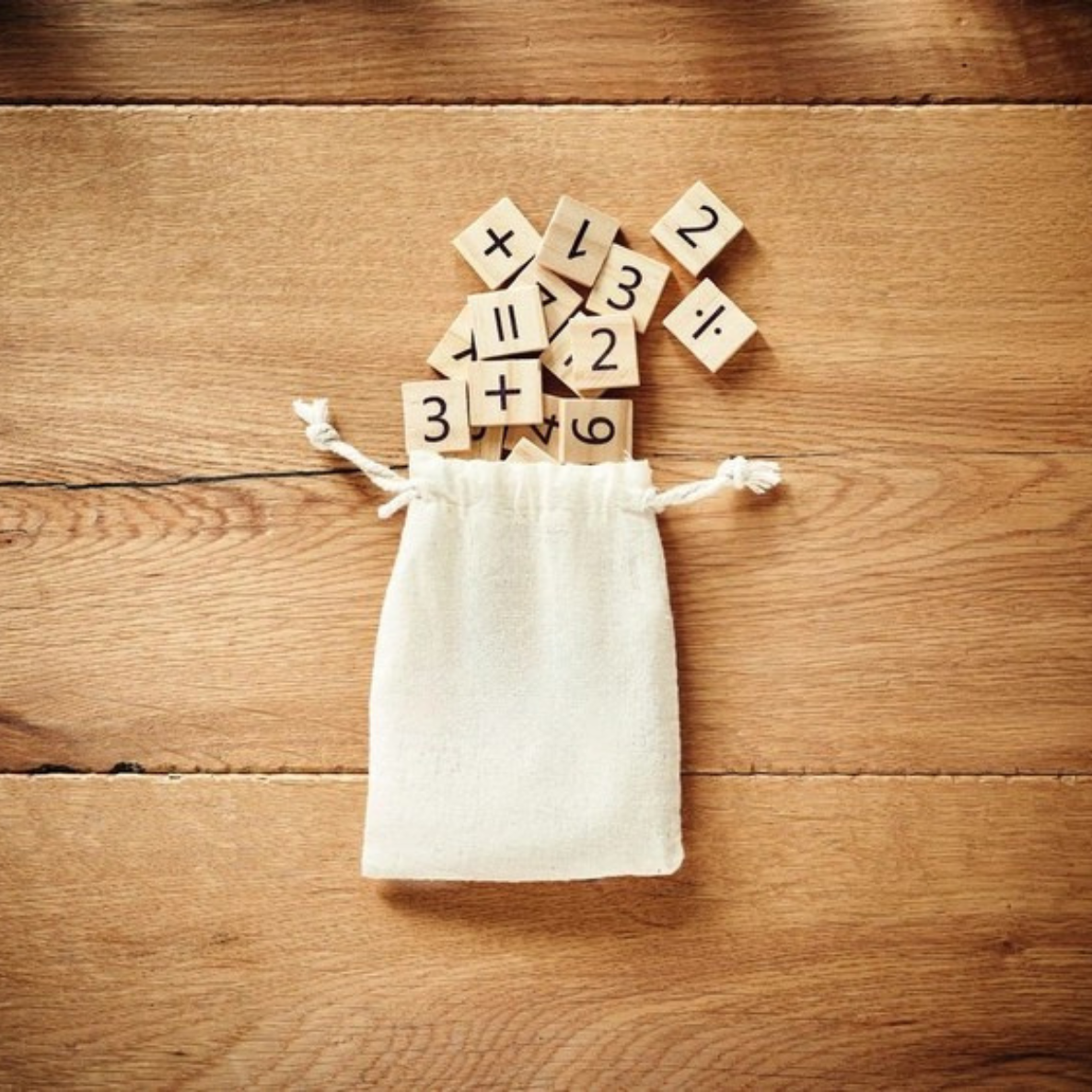 Ett lekfullt sätt att träna siffror och räkning. Setet består av 32 delar i trä och levereras i en smidig bomullspåse – perfekt att ta med till förskolan, på resan eller till mor- och farföräldrarna. Tåligt material, skön känsla i handen och lagom format för små händer.